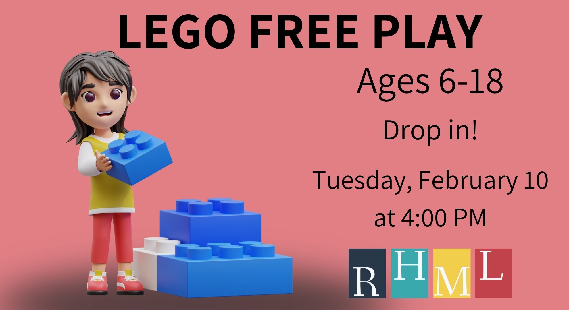 Enjoy an hour of free play with our Lego blocks. We have basic blocks, cool minifigs, and technic pieces. Bring your friends and compare what you’ve each built or make new friends and build something together. Drop in!